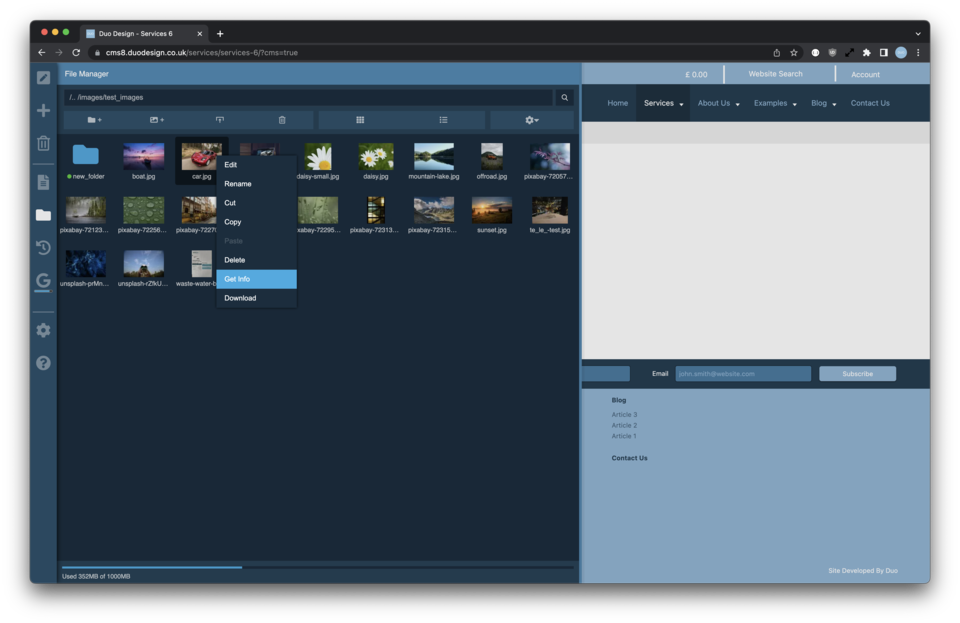 The info panel allows you to view the file size, as well as to set access rights to specific user groups. This is really useful if you have a members areas and want to limit access to specific users. The permissions systems allows files to inherit their permissions from their parent folder, allowing them to be set higher up in the file system and apply to multiple files, making it much easier to manage.