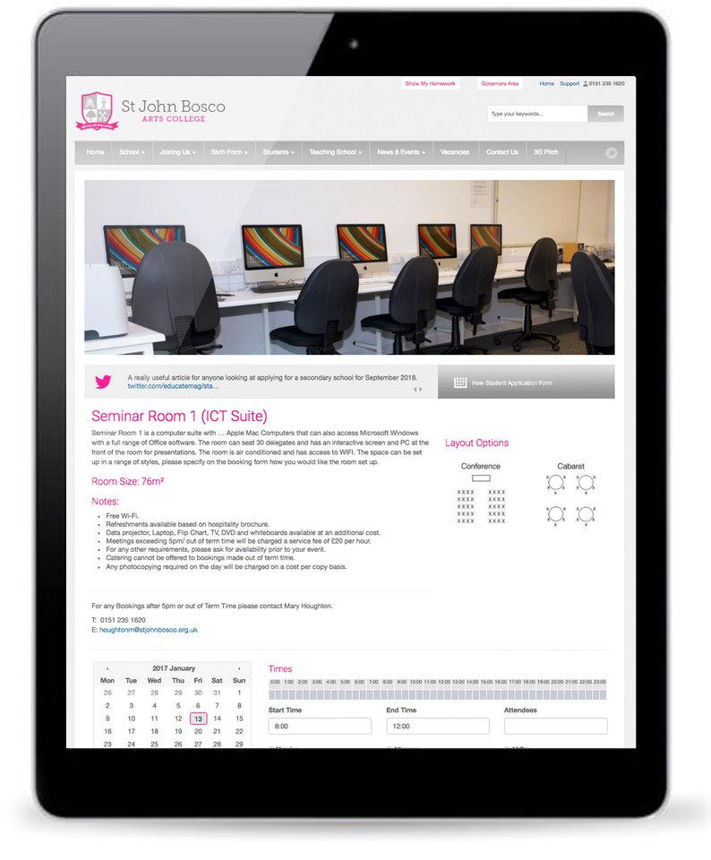 Outside of school hours, the facilities within school buildings are now commonly made available to the public and local businesses helping generate extra revenue from the schools facilities. This booking system can also help with this, from Sunday afternoon football, to evening classes, this extra income can bring a much needed boost to many schools, colleges and academies. And is all easily managed as part of the schools online web solution.