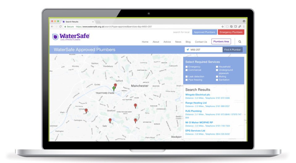 WaterSafe opposite represent many of the countries water suppliers and list all their approved plumbers (around 6000). The search works with postcodes, but also allows filtering by specific services. The system also lists the names of individual members of staff, so consumers can confirm the approval status of each plumber.